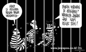 Artalyta Suryani, Si penyuap jaksa, bisa menjalankan bisnisnya di sel penjara dengan fasilitas dan ruangan yang mewah. Sementara hari ini (14/04) Jawa Pos memberitakan adanya “tahanan” Rutan Medaeng yang usianya baru 2 bulan. Di balik terali besi bayi tampan itu menjadi pesakitan bersama Ibunya yang harus menjalani hukuman pidana 10 tahun. Anda bisa membayangkan bagaimana membesarkan orok dalam ruangan 2×3 meter dimana dipan bayinya terbuat dari batu bata dilapis semen dengan kasur tipis dan selimut apa adanya?. Inikah yang kita sebut keadilan?. Terakhir, tgl 13/04 ini lambung kita serasa diaduk-aduk saat mengetahui Gubernur Lampung melantik Bupati-Wabup di dalam Rutan Bawanglatak-Lampung sekaligus melaksanakan sertijab. Ini karena sang Wabup adalah pesakitan di rutan tersebut. Mungkin ini semacam upaya mewujudkan libido untuk menyaingi Dahlan Iskan yang pernah melaksanakan sertijab di sebuah gardu induk PLN. Tahun 2014 mendatang bisa jadi pelantikan Presiden dilaksanakan di lapangan sepak bola atau sekalian diatas kolam lumpur Lapindo.
