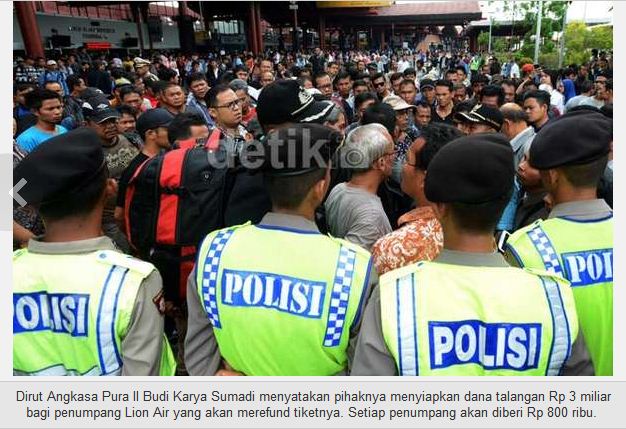 Sejak 18 Februari kemarin kita dikejutkan oleh berita tentang ratusan penumpang Lion Air yang terlantar dan sempat membuat heboh kondisi Bandara Soekarno-Hatta. Saya dapati kabar tersebut pada jumat malam lewat berita di media. Ratusan polisi disiagakan untuk menjaga keamanan bandara. Baru kali ini saya melihat polisi sebanyak itu antusias menjaga calon penumpang pesawat. Yang saya tahu biasanya mereka menjaga mahasiswa. Mahasiswa yang unjuk rasa. 🙂