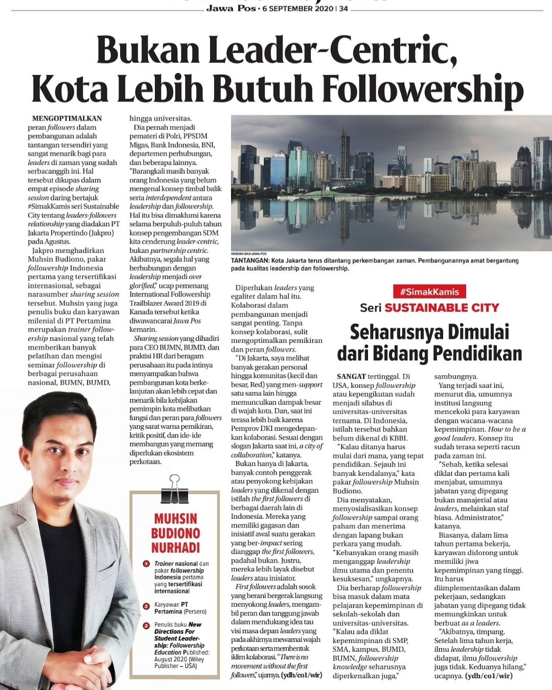 Mengoptimalkan peran followers dalam pembangunan adalah tantangan tersendiri yang sangat menarik bagi para leaders di zaman yang sudah serbacanggih ini. Hal tersebut dikupas dalam empat episode sharing session daring bertajuk #SimakKamis seri Sustainable City tentang leaders-followers relationship yang diadakan PT Jakarta Propertindo (Jakpro) pada bulan Agustus.